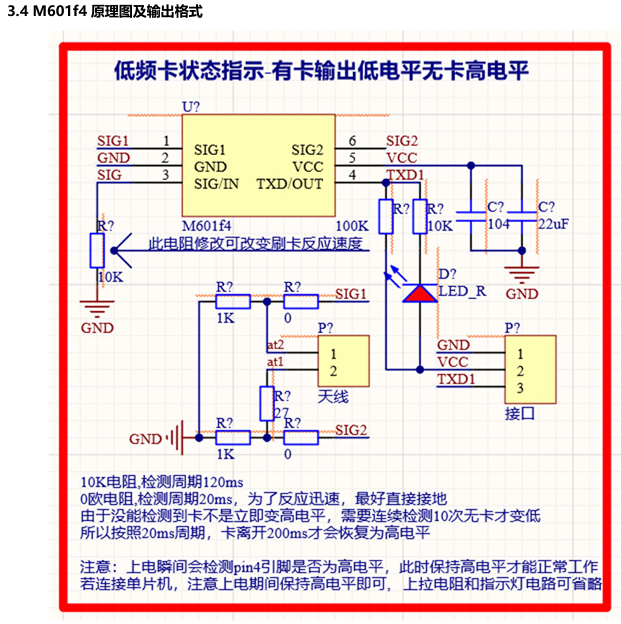 | M601f4 | 取電開關,有卡為低電平,無卡高電平 | EM4001/ TK4001/ EM4100/ TK4100/ T5557/ T5567/ T5577/ EM4205/ EM4305/ EM4469 及其兼容卡片 |