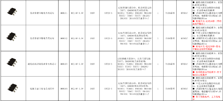 | M601f1 | 取電開關,延遲20秒(單純高電平輸出) | EM4001/ TK4001/ EM4100/ TK4100/ T5557/ T5567/ T5577/ EM4205/ EM4305/ EM4469 及其兼容卡片 |